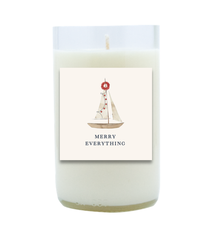 A festive design with a neutral sailboat reads, “merry everything”. Choose from our signature fragrances or select one of our special seasonal blends to make this design your own.
