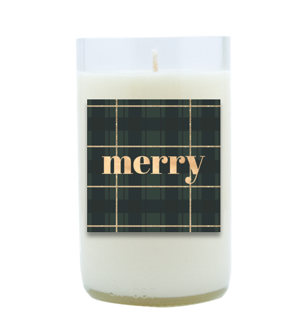 This candle features a classic green plaid design with the word “merry” in gold lettering. Choose from our signature fragrances to make this design your own.